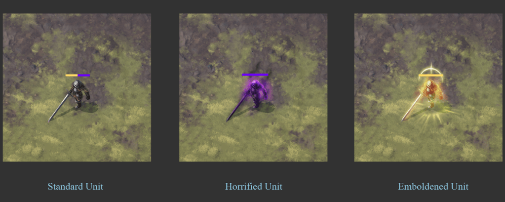 Units that slay enough enemies can gain a powerful buff called Emboldened. Emboldened Units gain some useful stat bonuses, but more importantly become immune to Horror. This is especially important for melee Units that are always at higher risk of Horror.