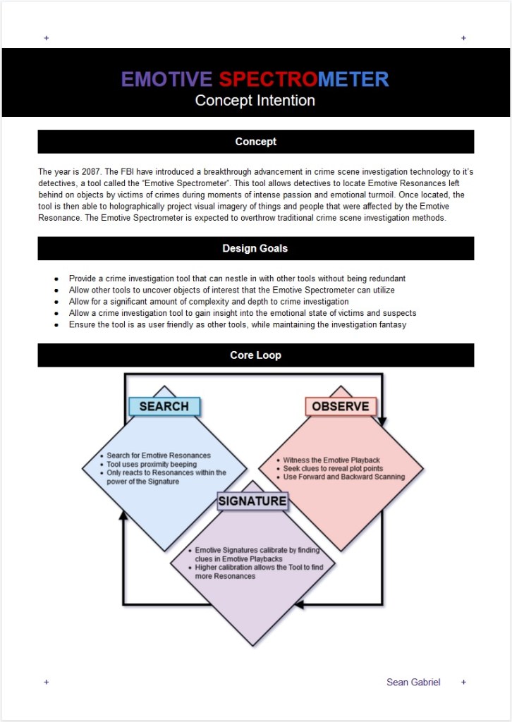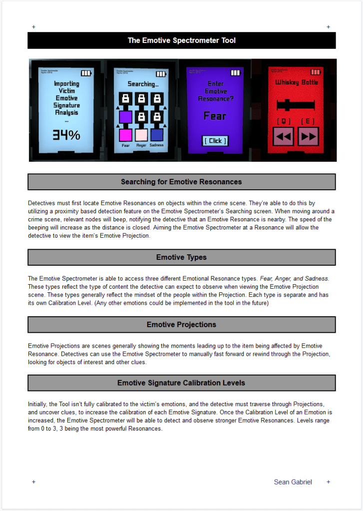 Emotive Resonance was a prototype I made to express an idea. The Emotive Spectrometer is a crime scene investigation tool introduced into a theoretical adventure game. The year is 2087. The FBI have introduced a breakthrough advancement in crime scene investigation technology to it’s detectives, a tool called the “Emotive Spectrometer”. This tool allows detectives to locate Emotive Resonances left behind on objects by victims of crimes during moments of intense passion and emotional turmoil.