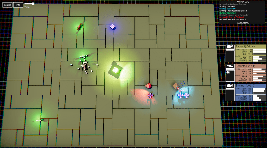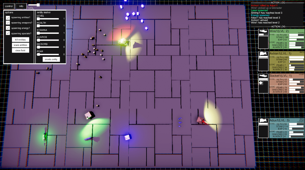 Avarice: Avarice is a stat that governs greed and consumption. Entities with a high Avarice will store Energy in their inventory more frequently, and will also hunt for Weapons and Energy more often, even if they don’t need them.