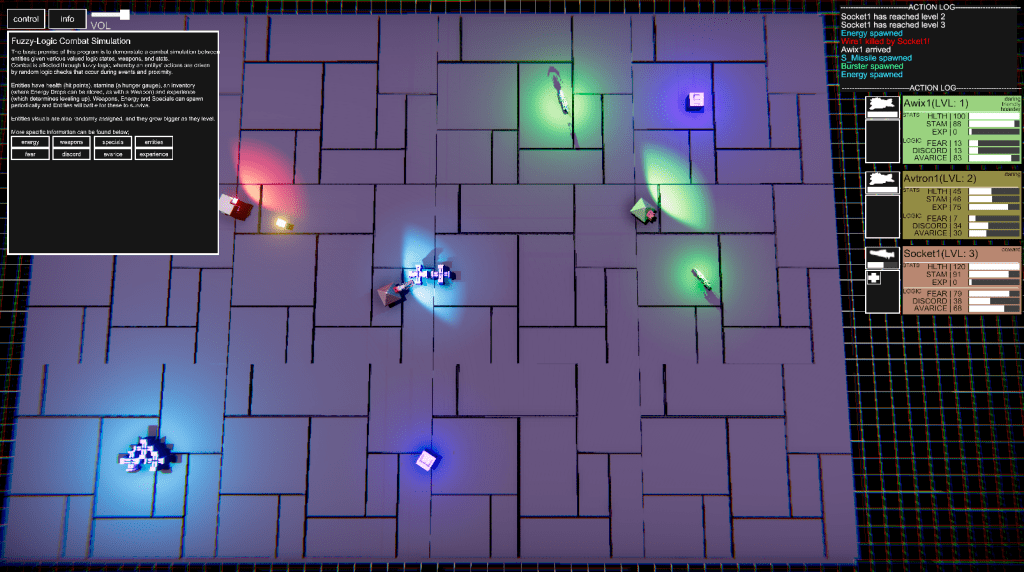Fuzzy Combat Logic Sim is a program I made to learn and demonstrate Fuzzy Logic in action. Each entity is given health, stamina and experience, along with three logic stats;