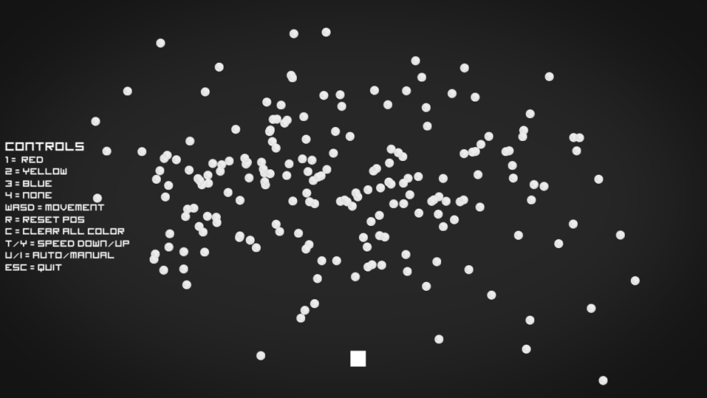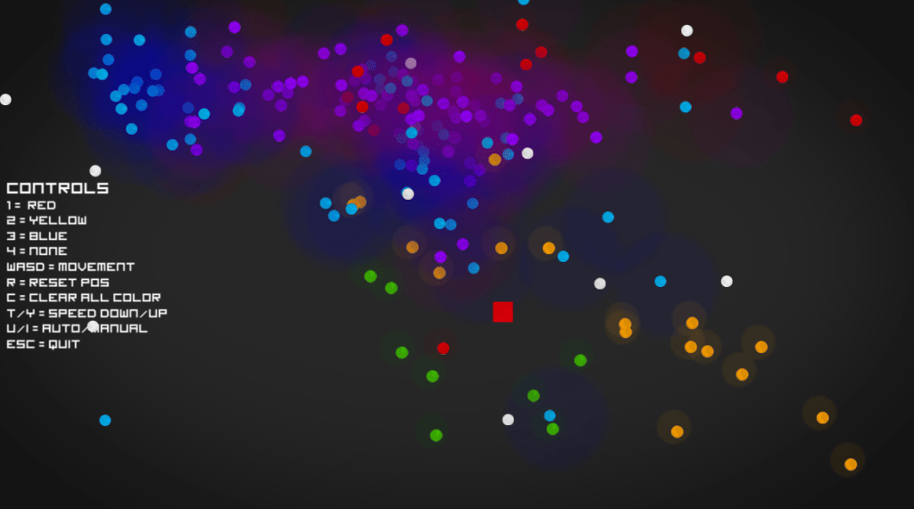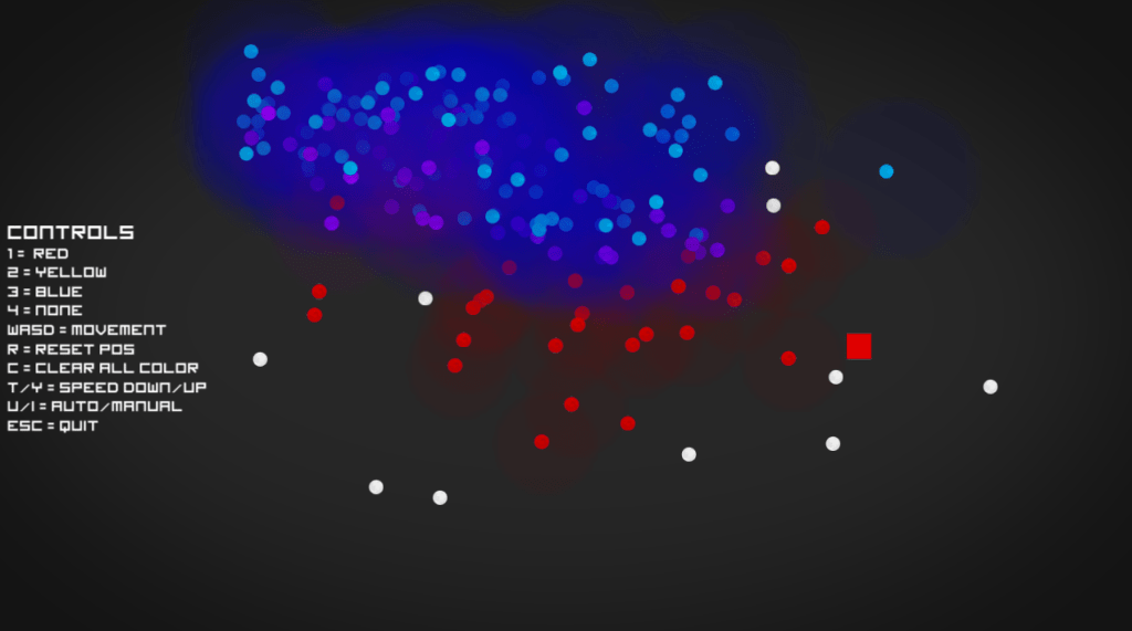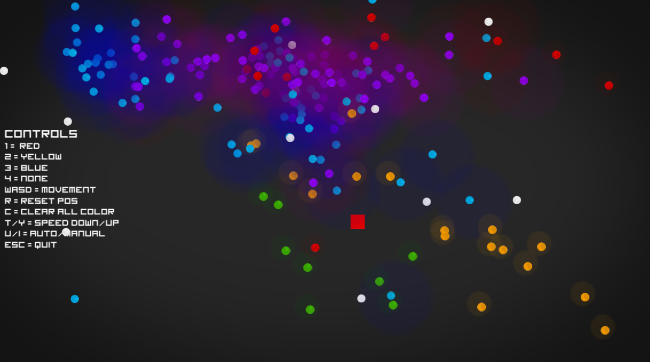 The project ended up becoming more of a simulation where the user can watch and control the sharing of color data between free moving entities. When there is more of a certain color, the influence of that color rises, and entities in proximity are more likely to learn that color.